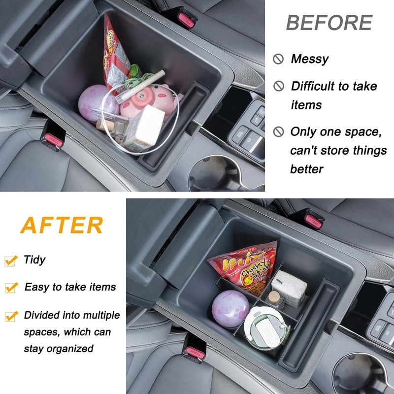 - Armrest Divider: Divide the armrest box into four departments to organize items, there is underneath it to put larger things and keep your armrest storage more organized.