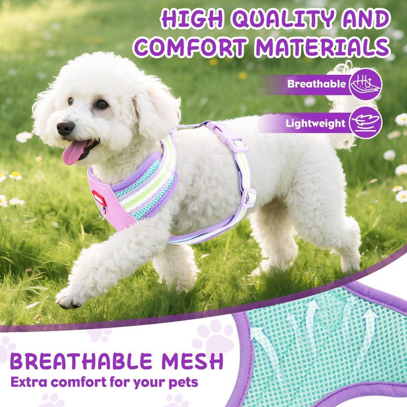 • 【Comfortable and Breathable】Our soft mesh dog harness features a mesh design for ultimate comfort. The breathable material keeps your pet cool on walks, perfect for all seasons. Available in vibrant purple and bright yellow to suit your dog's personality.