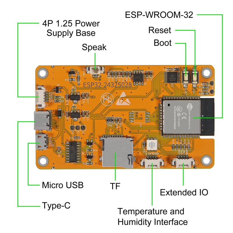 - ESP32-2432S028 development board is based on the company's ESP32-D0WDQ6 controller,dual-core CPU, clock frequency up to 240MHZ,integrates a wealth of resource peripherals,high-speed SDIO, SPI, UART and other functions, supports automatic download.