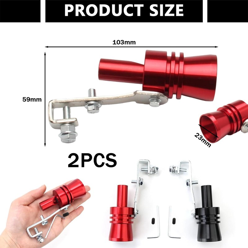 - 【Product Introduction】The packaging includes 2 pieces exhaust whistle(black and red), with dimensions of 103mm (4.06in) * 59mm (2.32in) and a whistle size of 23mm (0.90in).Before purchasing, it is best to confirm the inner diameter of the exhaust port.