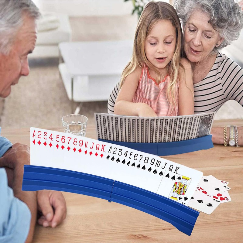 Gift for children or Seniors: Foldable and Curved Playing Card Holders, Plastic Hands Free card holder for kids Adults Seniors, Poker Parties, Family Card Game Nights Specification: Packing: 2 Pcs Foldable and Curved Playing Card Holders Quantity of the cards be holded: 50+ Size: Expand: 13.8" x 1.1" x 1.5" Shrink: 7.3" x 1.2" x 2.8" Color:Blue Note: Playing cards are not included.