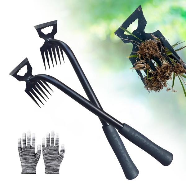 - 【2024 New Weeding Tools】There are 2 gardening hand weeder tools with shafts and a pair of rubber gloves in the package, easy to use, just simply place the curved metal base on the ground, then dig and pull around the roots, use the tip of the tines to dig Just pry; weed puller tool is the perfect helper for farm work such as weeding, digging and shoveling.