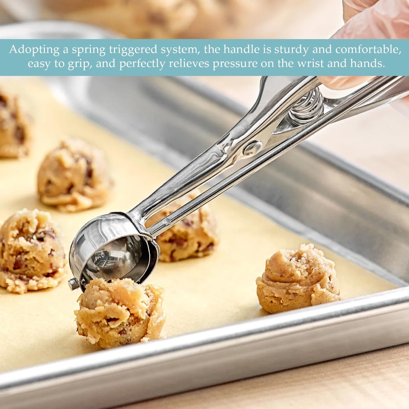 - Ergonomic Design: The cookie scoop adopts a spring triggered system, with a sturdy and comfortable handle that is easy to grip, perfectly relieving pressure on the wrist and hand. After squeezing, the cookie dough can be easily released without any effort, and the ice cream scoop can be comfortably placed in the left or right hand. Our ice cream scoop with trigger comes in two sizes, with a diameter of 4cm and 6cm respectively.