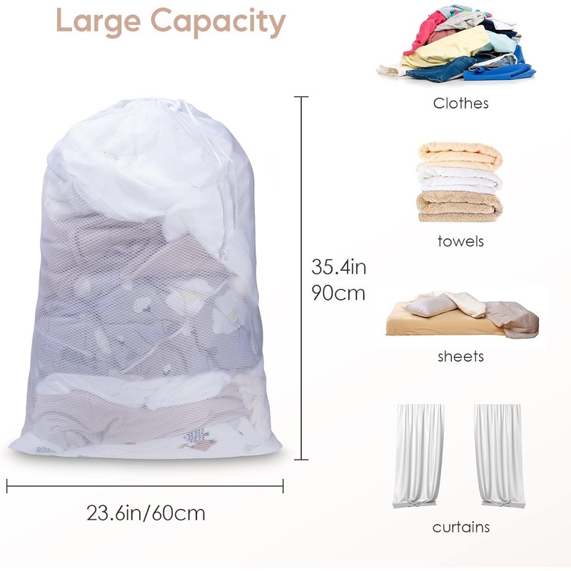 2Pcs Large Mesh Laundry Bag with Drawstring,23.6×35inch Washing Bag Net for Washing Machine (White)