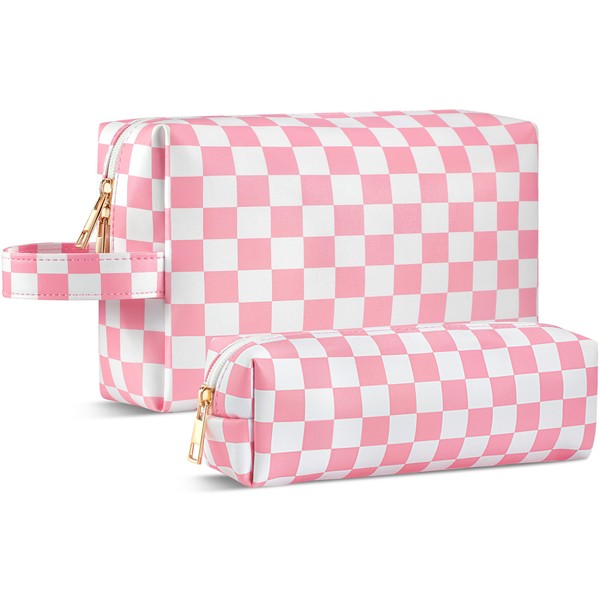 2Pcs Makeup Bag for Women, Large Checkered Cosmetic Bags with Small Makeup Brushes Bag Set, Cute Leather Make Up Orgnizer with Zipper, Travel Skincare Toiletry Storage Bag for Teens Girls Gifts(Pink)