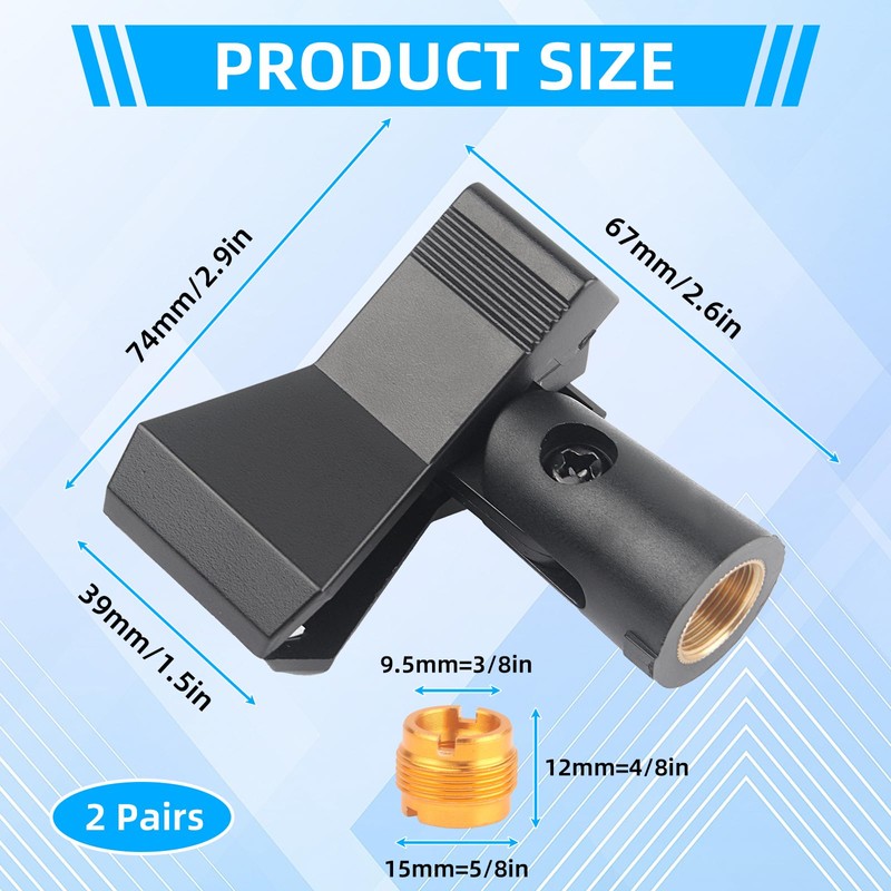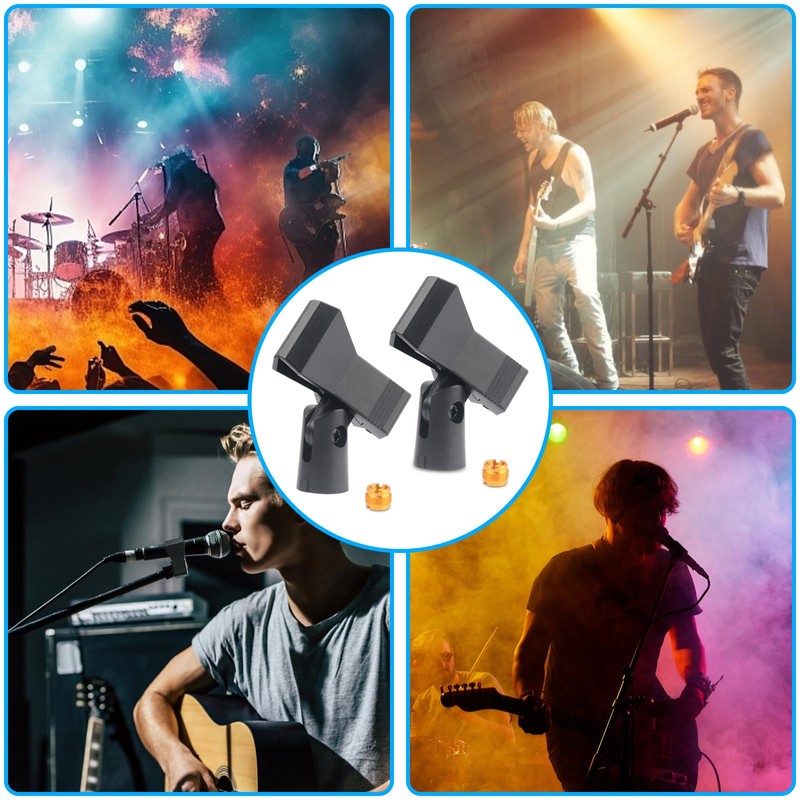 - Broad Compatibility for Versatile Use: Designed to fit microphones with diameters between 15-50mm (0.59-1.97 inches), these clips are perfect for a wide range of microphones. The included screw adapters make them compatible with most mic stands (outer diameter 32-60mm), ensuring they work seamlessly with your existing equipment.