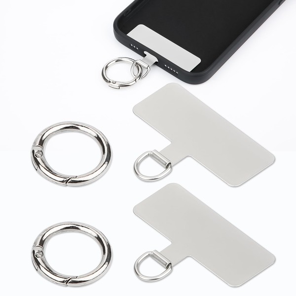 2pcs Phone Tether Patch, Metal Phone Tether Tabs with 2pcs Spring Rings Cell Phone Lanyard Patch Replacement without Adhesive for Most Cell Phones (Silver)