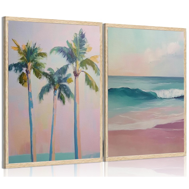 2Pcs Pink Beach Canvas Wall Art, Peach Palm Tree Canvas Print Wall Decor Preppy Prints Artwork Painting Beach Decoration for Gallery Living Room Bedroom, Unframed (12x16inch)
