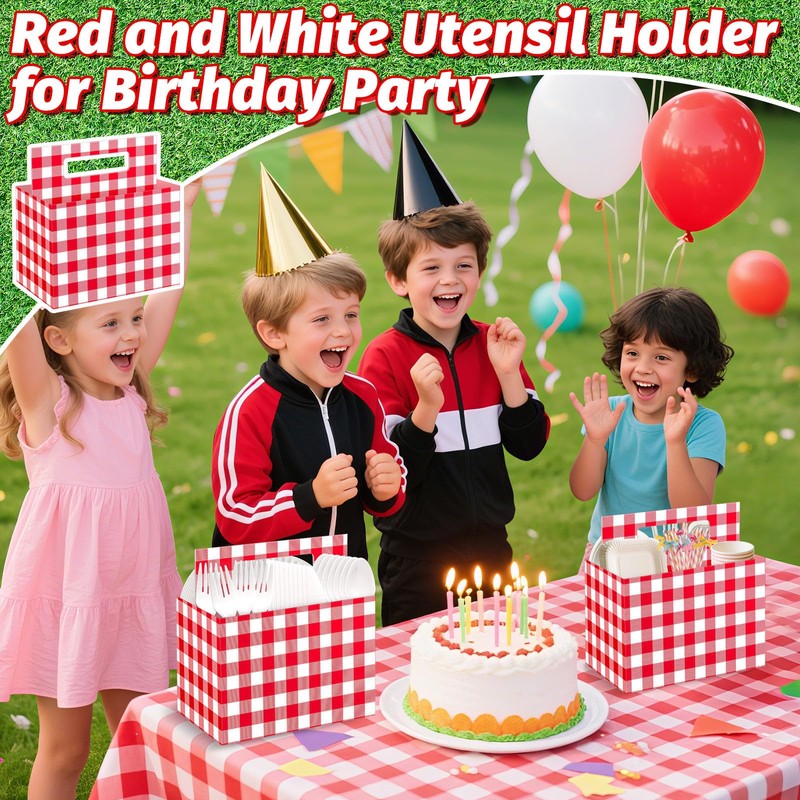 • Exquisite Gingham Party Supplies:The red and white checkered pattern with high-contrast coloring,has become an extremely popular retro design element.The open-top design allows easy access to all tableware, and the cut-out handles make it portable. This is a stylish red gingham utensil holder for birthday party supplies.