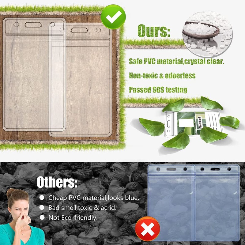 • 【Waterproof Dustproof & Soft Sturdy】Our horizontal and vertical badge holder card pouches are waterproof. can easily hold 3pcs credit card size cards. The name badge holder is made of premium PVC material, non-toxic, odorless. Both sides of each badge holder are transparent which makes scanning ID seasy