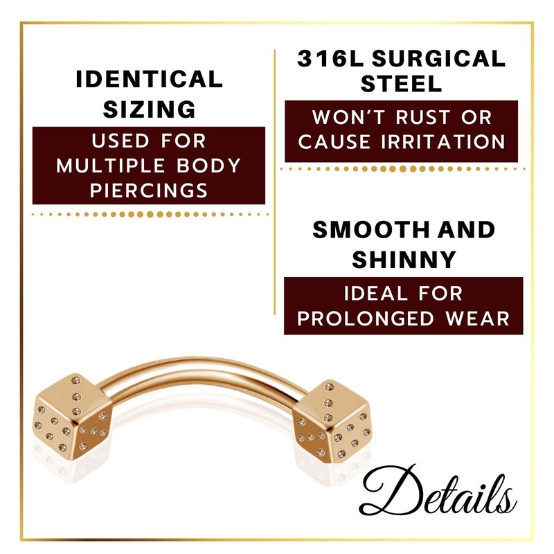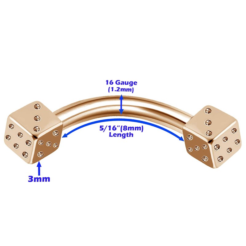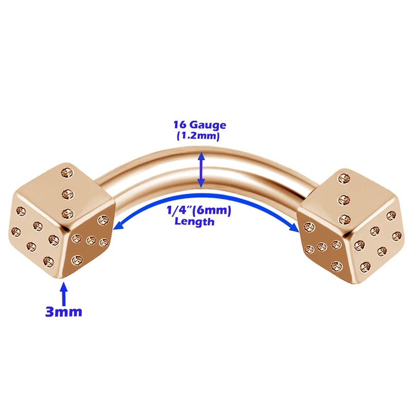 - 2Pcs set includes 16g (1.2mm) Rose Anodized Surgical Steel Curved Barbell Earing 3mm dice 1Pc of 16g (1.2mm) 1/4 (6mm) Rose Anodized Surgical Steel Curved Barbell Rings 3mm dice. 1Pc of 16g (1.2mm) 5/16 (8mm) Rose Anodized Surgical Steel Cartilage Earring Curved 3mm dice. Item comes with a nice bag.