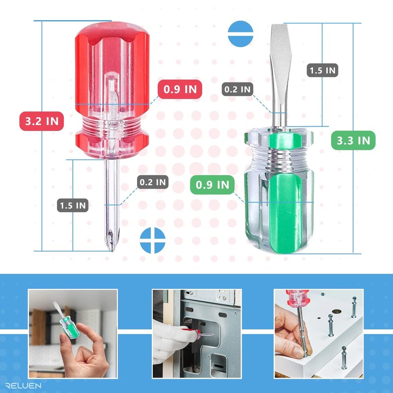 - Convenient Size: The size of slotted screwdriver is 1.5 inch in length and the handle of short flathead screwdriver is 0.9 inches in width. The total length of flathead screwdrivers is 3.2 inches and width about 0.2 inches.