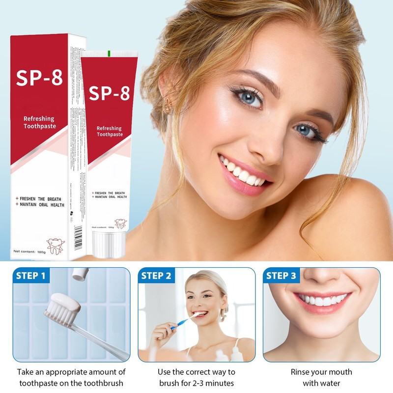 - 【Deep Cleaning】Sp-8 toothpaste helps to effectively clean teeth, remove food particles and deep stains embedded in the teeth, so that you can have a healthy and refreshing mouth.