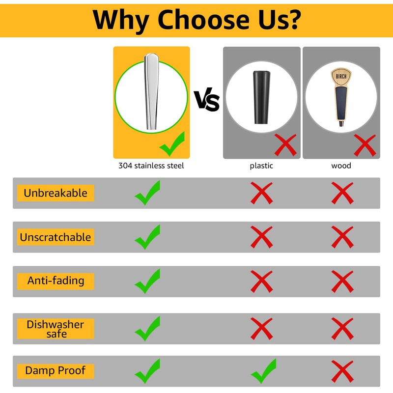 - All Stainless Steel Beer Tap Handle: the beer tower tap handle made of solid 304 stainless steel, waterproof, moisture-proof, rust and corrosion-resistant, no paint or colour loss, non-cracking, is built to last. Mirror-polished design keeps your kegarator beer faucet handle looking new all the time, perfect for commercial beer bars.
