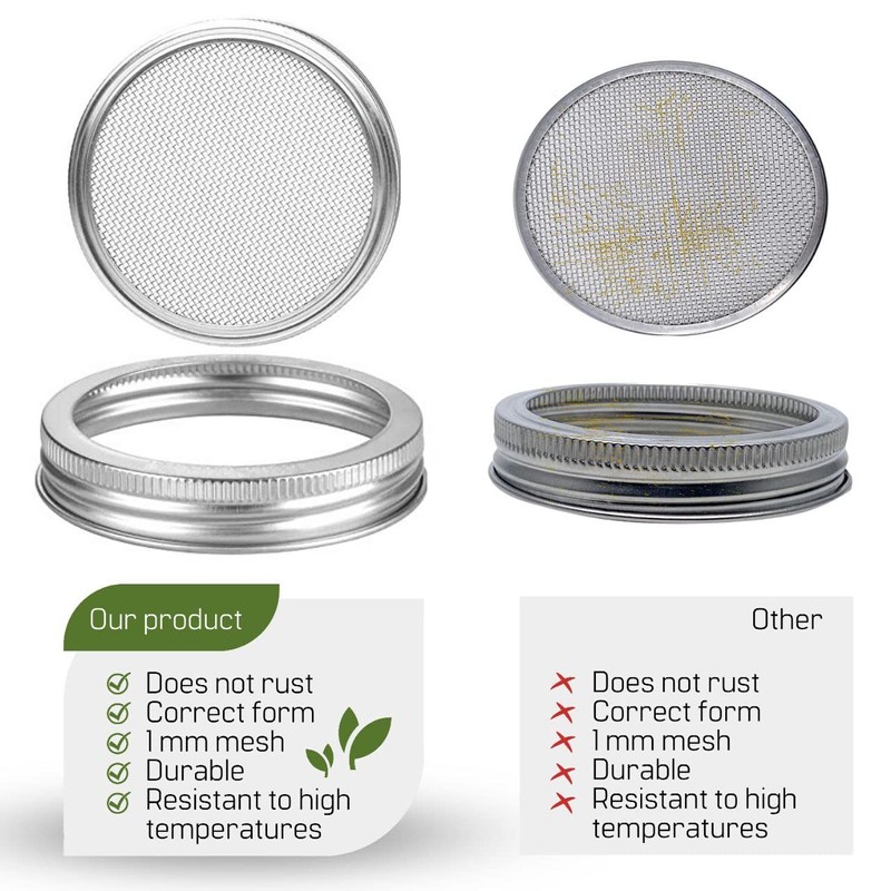 - Wide mouth jar lids stainless steel mesh provide great air circulation, hindering damages your seeds and sprouts. The rings and screens of sprout lids for sprouting jars easy to separate, what making cleaning quick and comfortably