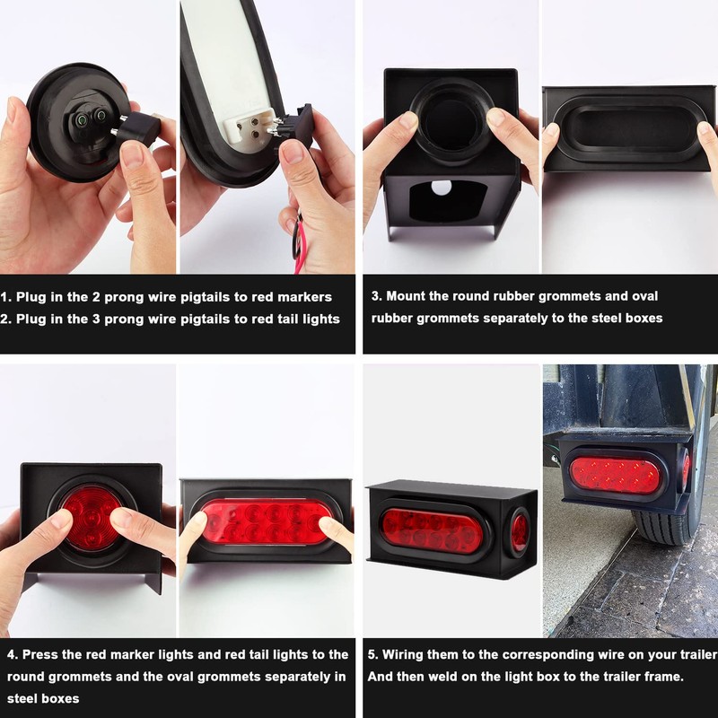 2Pcs Steel Trailer Lights Boxes Housing Kit w/6 Inch Oval Red LED Trailer Tail Lights 10LED and 2" Round Red LED Side Marker Lights 4LED, Grommets and Wire Pigtails Connectors Included