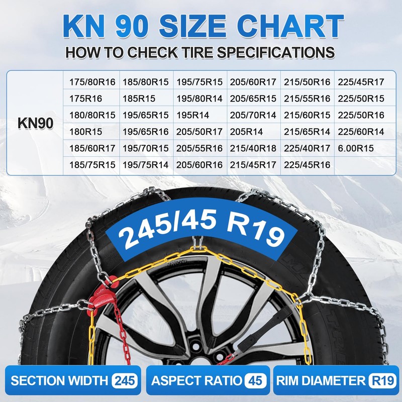 - 【Versatile Usage】The KN90 snow chains are designed for a wide range of vehicles, including pickup trucks, cars, SUVs, and sedans. Perfectly suited for tires with widths of 180 185 195 205 215 220 225mm (refer to product images for details), our tire chains are essential for travel, snow, mud, climbing, icy conditions, and other emergencies. Note: Be sure to verify your tire size to ensure compatibility with our tire chains.
