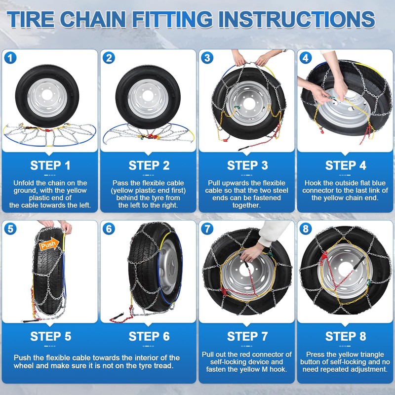 - 【Easy to Install and Remove】Our snow chains for car tires are quick and easy to install—no jack or tire removal needed. Just follow the included instructions, and they’re ready to go! Designed for quick setup in emergencies and extreme weather conditions, our tire chains for cars, trucks and SUV are ideally suited for emergencies and extreme weather conditions.