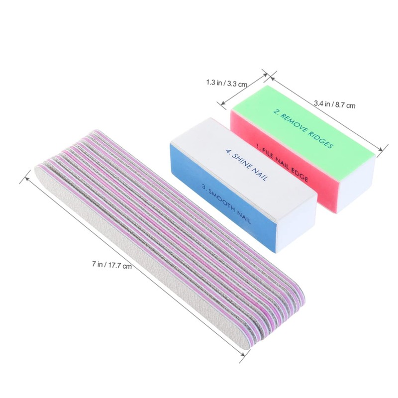 Nail Files The item is a set of 2pcs 4-way nail buffers and 10pcs nail files, and features 4 different textured sides with different functions to file natural nails, false nails, nail extensions, etc.nail buffers - Size: About 9x3.nail tool - Can be used before applying nail polish or nail treatments.Nail Shinner Buffer Manicure - To and shape up uneven nail surface before UV gel and acrylic application.emery boards - Material: Durable sandpaper and sponge.metal nail file Manicure and Pedicure with Friends.metal sponge Features - Color: As shown.Washable Buffer File 4 sided buffing block 4 in 1 buffing block allows you to smooth, and shine nails all in one tool.Nail Art Polish - 4-Way Nail Shiner Sponge Nail Files Nail Buffers Sanding Blocks.metallic nail polish 9cm.nail art tool 9x2.fingernail file - 4 different textured sides , for toenail & finger nail care.nail sanding blocks - general manicure purpose