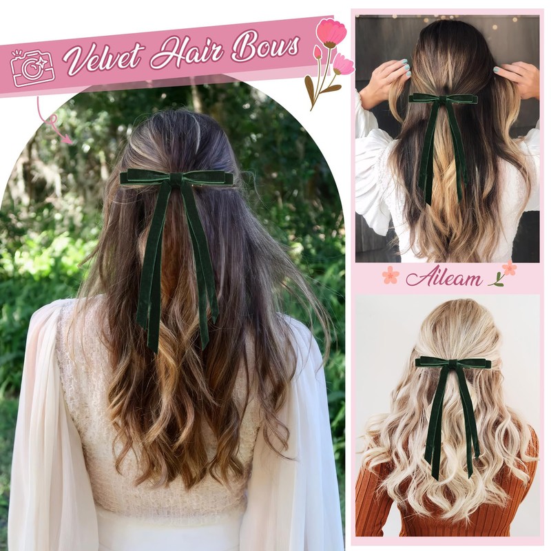 - COLORFUL VELVET HAIR BOW-- 2 Pcs Green velvet hair ribbon bow clips fit any outfits , which keep you be different everyday. You could DIY any hairstyle just you want with AILEAM's hair bows and attending parties, ceremonies and daily wearing.