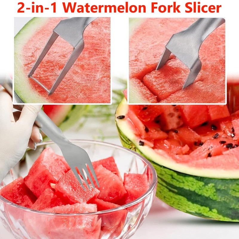 2Pcs Watermelon Fork Slicer Cutter, Stainless Steel 2-in-1 Watermelon Fork Slicer, Portable Watermelon Cutter Slicer Tool Fruit Forks Slicer for Home Party Camping Kitchen Gadget