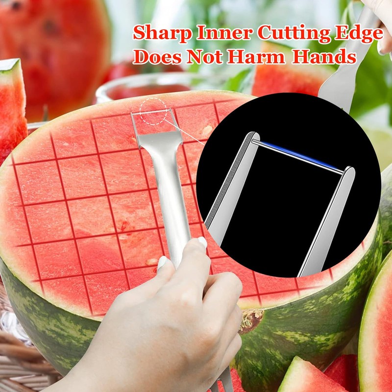 - 【Stainless Steel Material】 The watermelon slicer cutter tool is made of 304 stainless steel, sturdy in construction, rustproof, and not easily damaged. The square blade of the watermelon cutter is not sharp and will not cut your hands. The stainless steel watermelon slicer features a polished handle with a round fork head for easy handling.