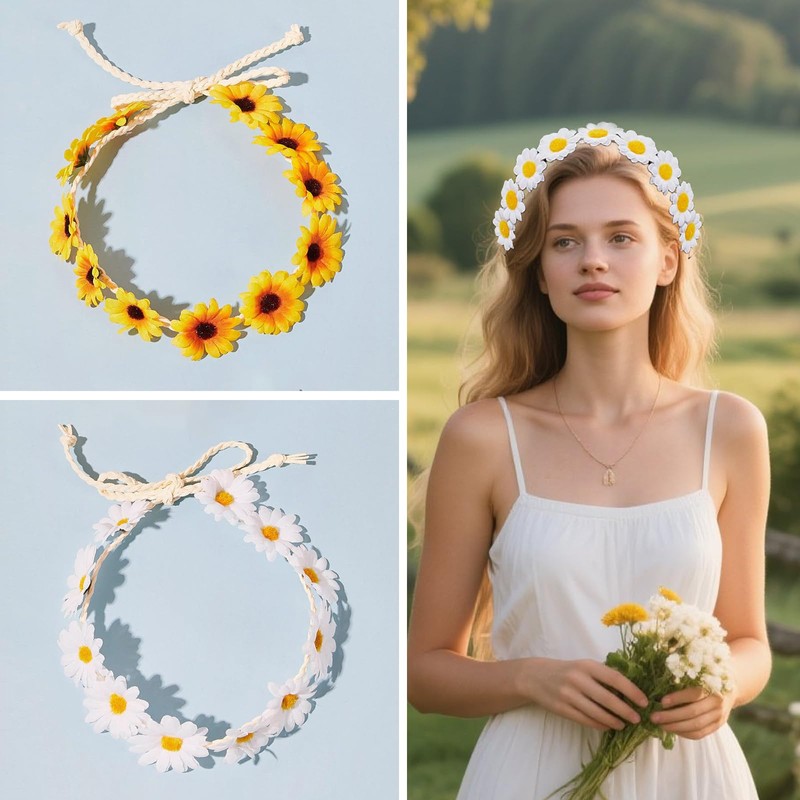 2Pcs White and Yellow Daisy Flower Headband Crown Boho Flower Headband Floral Hair Wreath Boho Headpiece for Bridal Women Girls Hippie Wedding Party Beach Festival