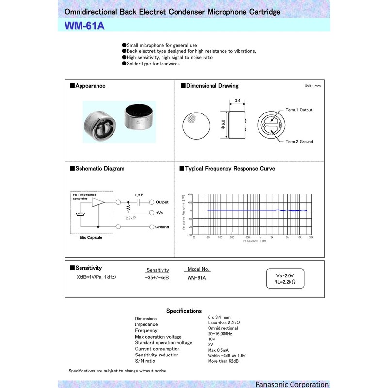 - WM-61A Omnidirectional Back Electret Condenser Microphone Cartridge Capsule.