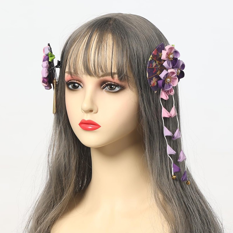 2Pcs Womens Japanese Kimono Flower Hair Clips Tassel Hair Hairpins Traditional Kanzashi Hair Accessories Set