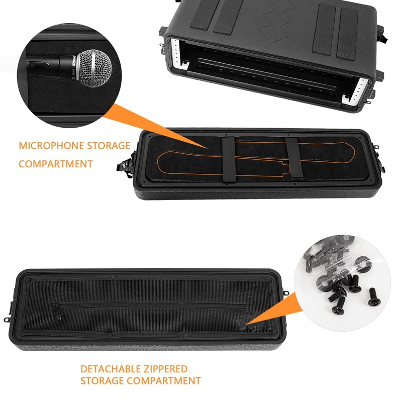 - Extra Storage Space: This flight case features detachable front and rear lids. The lid with microphone compartments allows for customized placement of 2 microphones, while the lid with a mesh pocket on the other side allows you to accommodate other effect units.