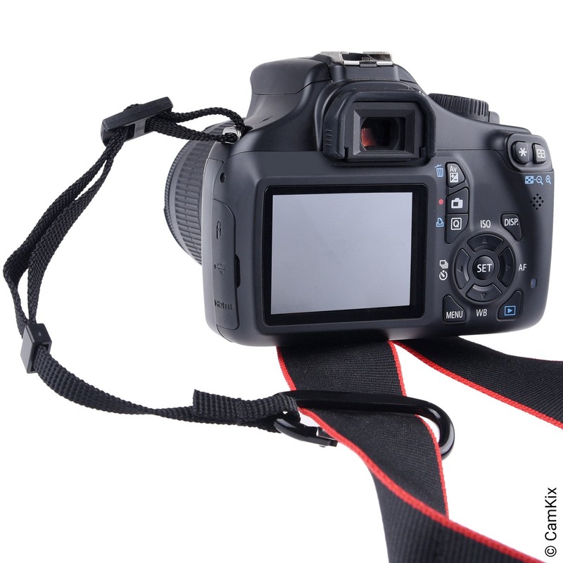 Befestigen Sie zuerst die Schnur an der Öse Ihrer Kamera. Schließen Sie es dann zur zusätzlichen an den Umhängegurt Ihrer Kamera an. Siehe die Produktbilder für Beispiele.