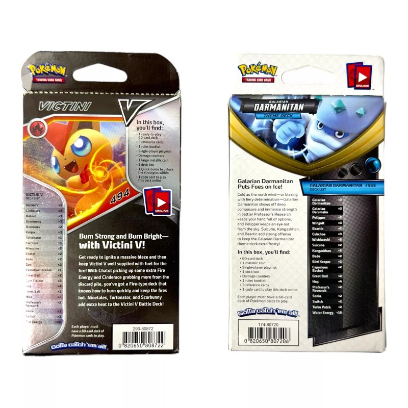 This bundle includes two theme decks featuring the popular Pokémon Sword & Shield set, one with a focus on the Darmanitan and the other on Victini V. With a total of 120 cards between the two decks, you'll have plenty of options to build your perfect deck and dominate your opponents. The decks are perfect for beginners and experienced players alike. Minor scuffs to boxes.