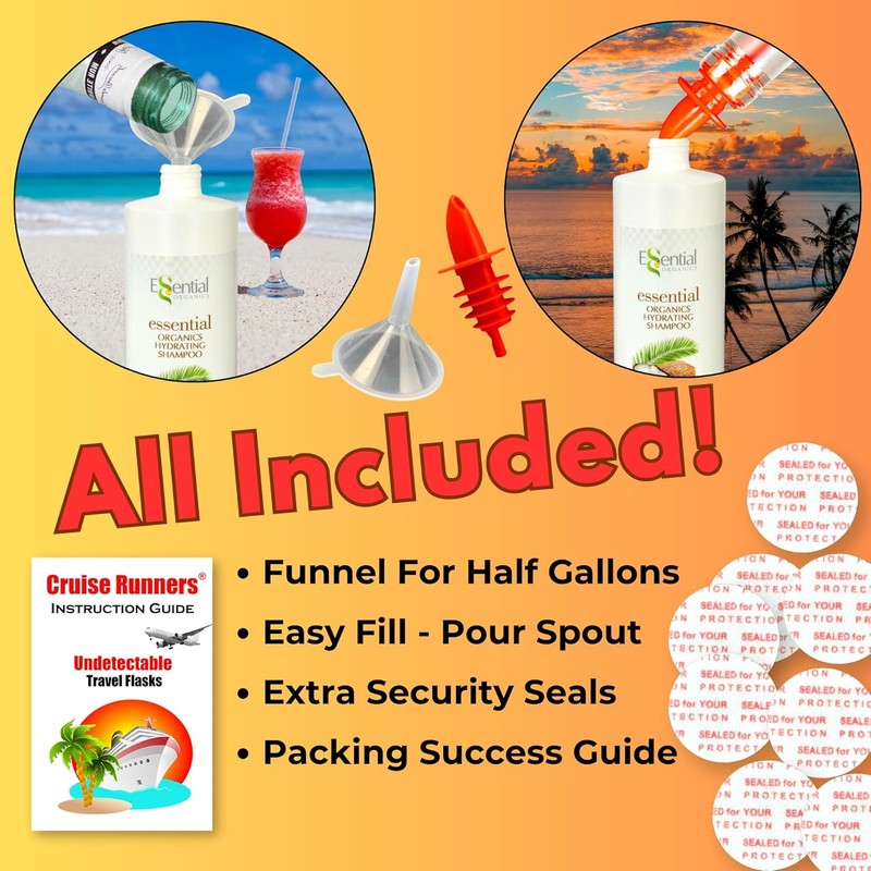 - KEEPING IT SIMPLE AND SMART Reusable Cruise Runner Plastic Flask Kit includes two 17.3 oz bottles, (over 1 Liter of fun stuff) funnel, liquor pour spout and extra tamper-proof seals for the next time you use your shampoo flask for cruise.