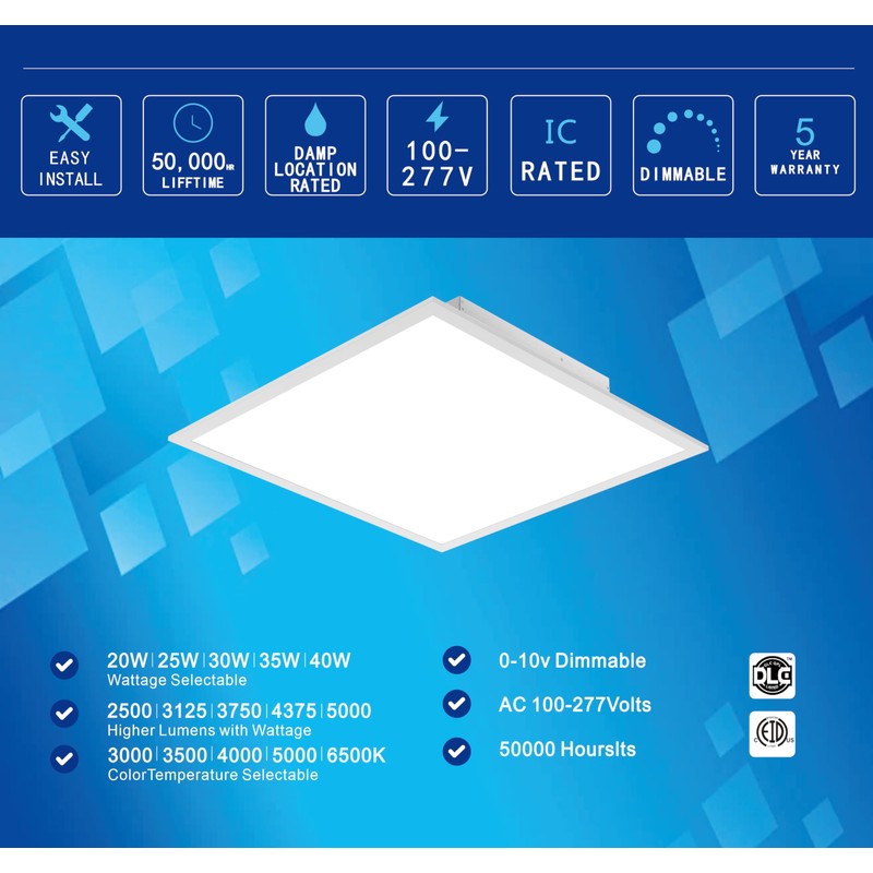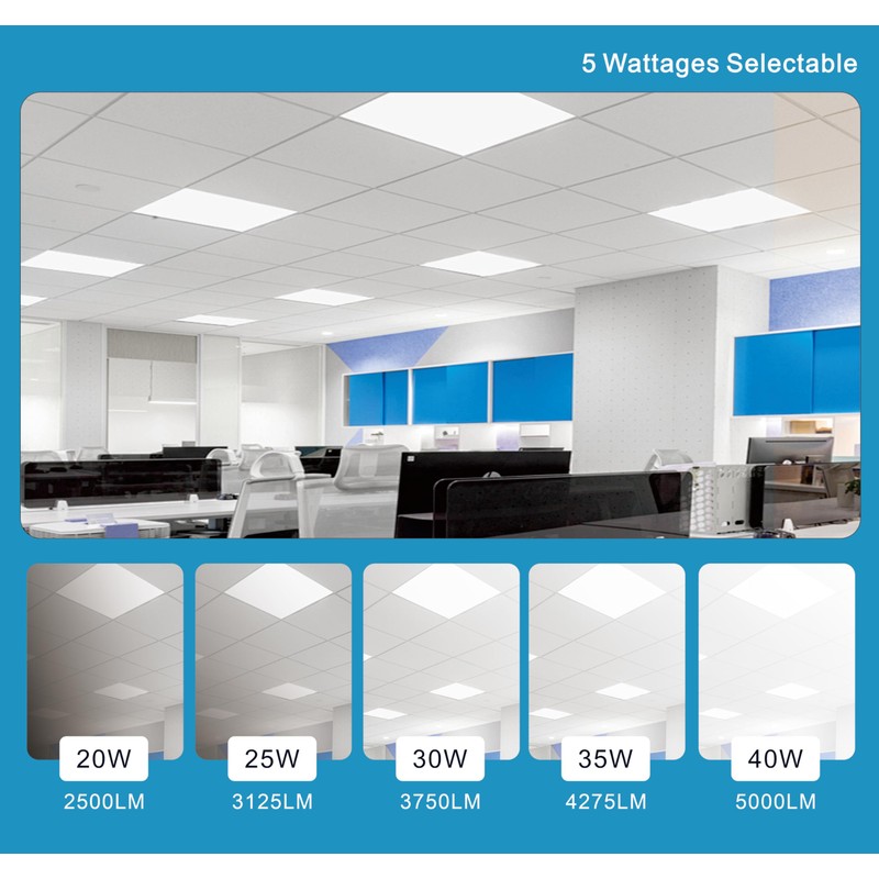 - Versatile Lighting: This 2x2FT LED panel offers 5 wattage options (20/25/30/35/40W) and 5 color temperature selections (3K/3.5K/4K/5K/6.5K) to suit various lighting needs.