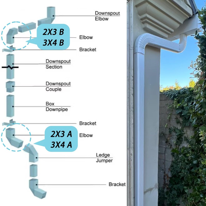 - Downspout Gutter Elbow: 2x3 B-type 90-degree side rain gutter elbow. Please verify this elbow's compatibility with your existing downpipe system before ordering