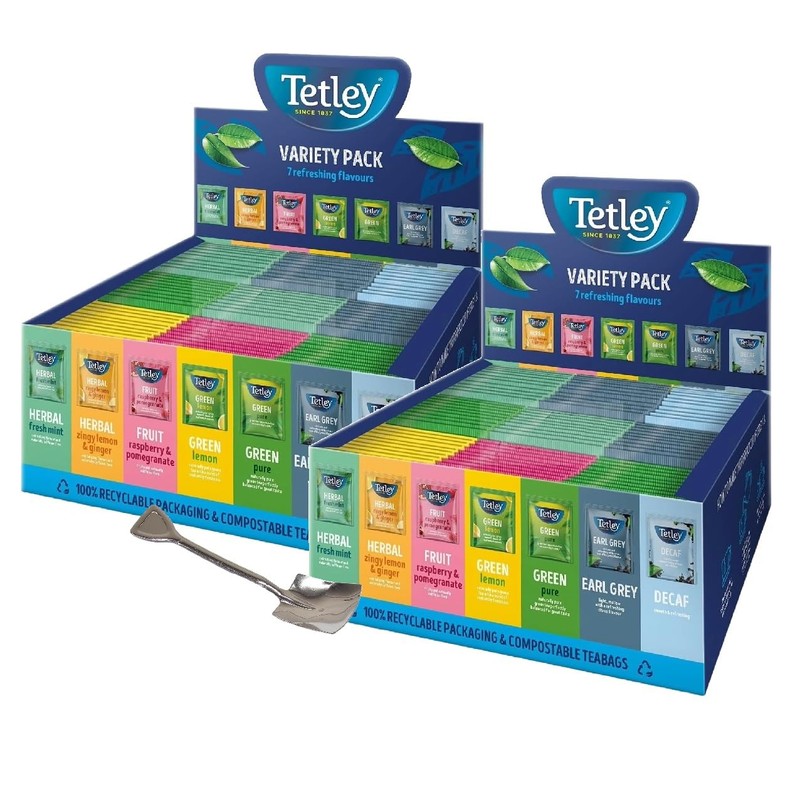 This variety packs are ideal for caterers and casual tea drinkers alike. The Variety Box is bursting with natural and intense fruity flavours to satisfy any palate, including: Herbal Fresh Mint, Fruit Raspberry & Pomegranate, Pure Green Tea, Earl Grey, Lemon Green Tea, Decaf and Herbal Zingy Lemon & Ginger.