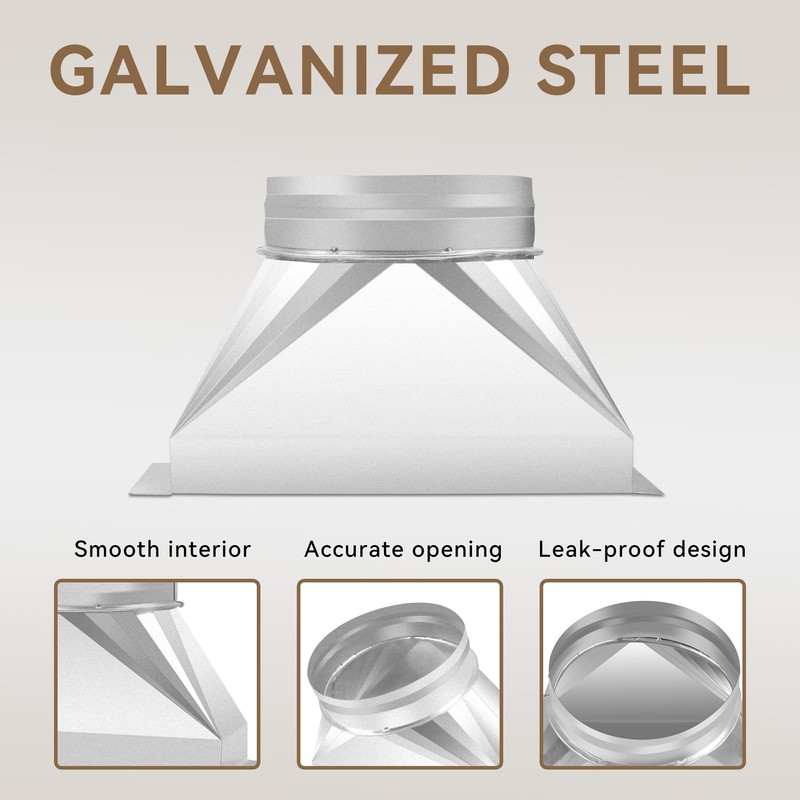 - Durable Construction: Made of heavy-duty galvanized steel, this rectangular-to-round duct transition resists rust, corrosion, and harsh weather, ensuring long-lasting performance for both indoor and outdoor ventilation systems