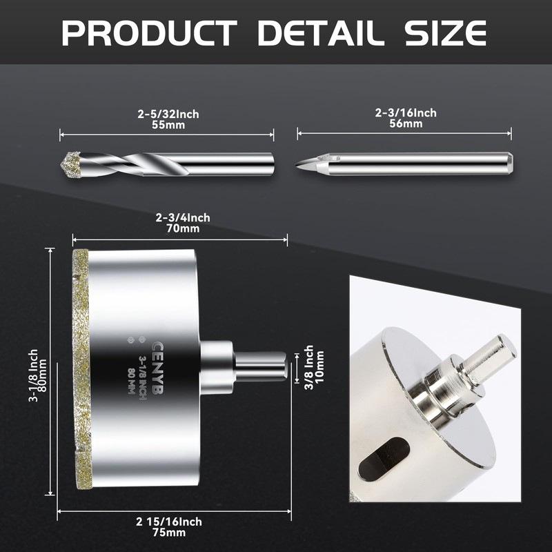 3-1/8inch | 80mm Diamond Hole Saw with Center Drill bit and Diamond-Coated Center Drill bit for Ceramic Glass Marble Fiberglass Granite and Porcelain Tiles by CENYB