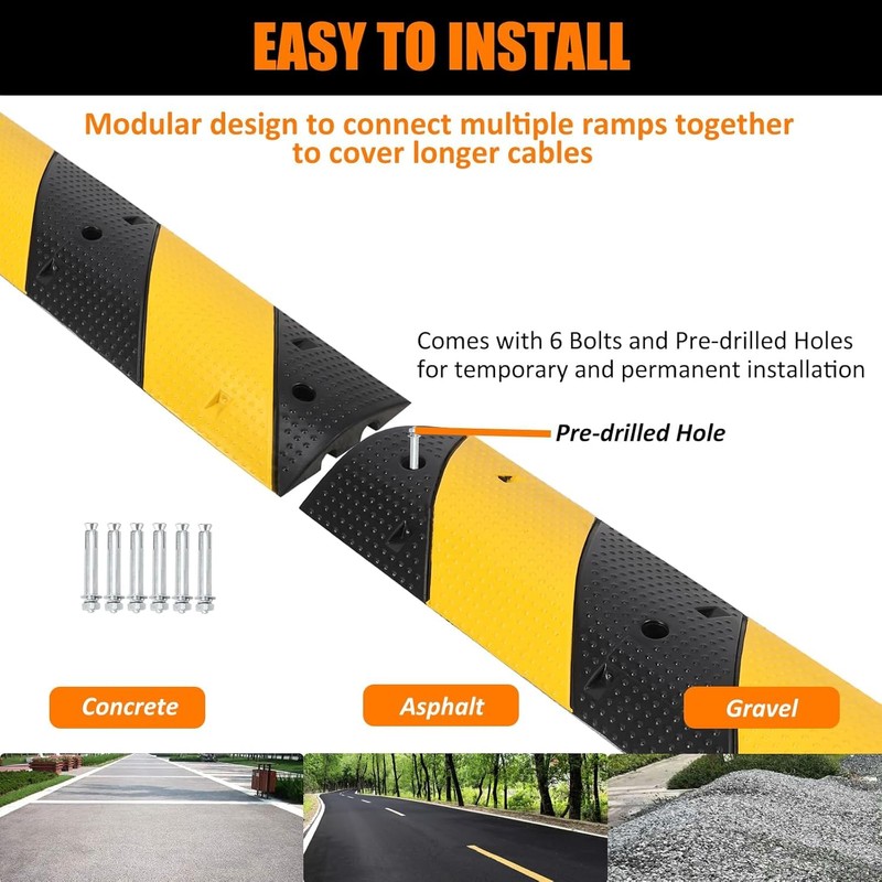 - High-Performance Load Capacity: Engineered to support up to 25,000 lbs, these rubber speed bumps protect cables and infrastructure on concrete, asphalt, or gravel surfaces. The reinforced construction withstands repeated compression without compromising protective functionality.