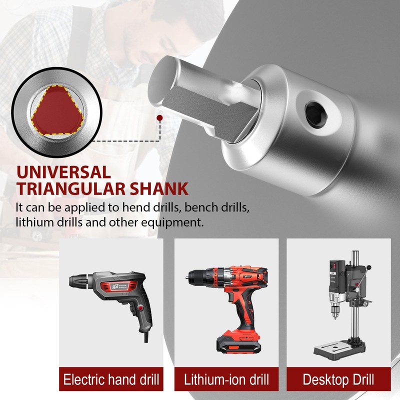 - Wider Compatibility: These hole openers adopt 3/8 inch three-flat shank design, which is compatible with various drills, CNC drills and other handheld power tools. The design ensures that the chuck is firm and stable, minimizing slippage during heavy-duty cutting tasks.