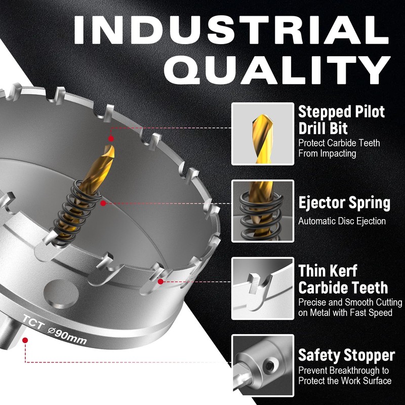 - Precision fit: Our Tungsten Carbide Tip (TCT) hole saws are designed to smoothly cut through hard materials such as stainless steel, aluminum, high alloy steel, copper, plastic and PVC, ensuring clean, precise cuts