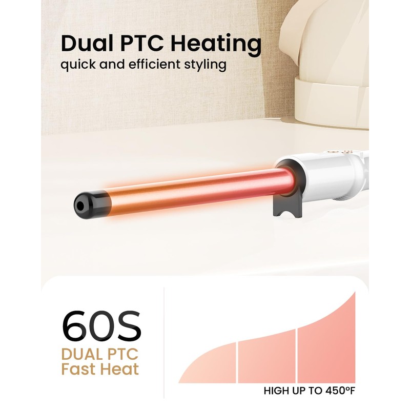 - Rapid Heating in 60 Seconds & 11 Heat Settings: The curling iron’s barrel is equipped with Dual PTC technology, heating up in just 60 seconds. It ensures fast and even heat distribution, allowing you to curl your hair within seconds. With 11 adjustable heat levels ranging from 225 to 450℉, it caters to all hair types, providing the perfect temperature for styling.