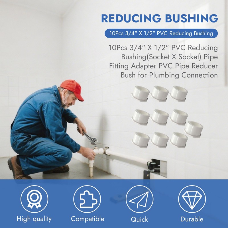 - 3/4 x 1/2 Inch PVC Reducing Bushing 10 Pcs White Pipe Fitting Adapter Socket x Socket Connection Plastic Schedule 40 Pipe Reducer Bush for Home Plumbing, Pool & Industrial Use