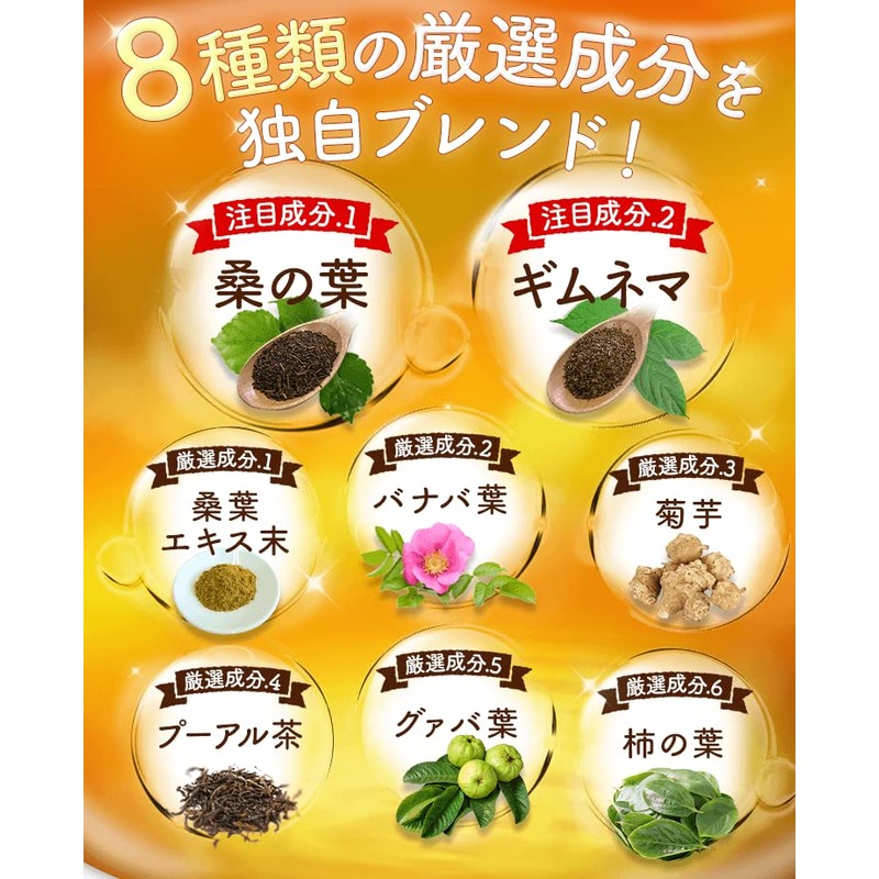 - ✅ 桑の葉とギムネマ、プーアル茶、バナバ葉、グァバ葉、菊芋、柿の葉など、8つのサポート成分がバランスよく配合されています。これらの成分は甘いものを食べ過ぎる方にぴったりの栄養成分を豊富に含んでおり、健康をサポートします。