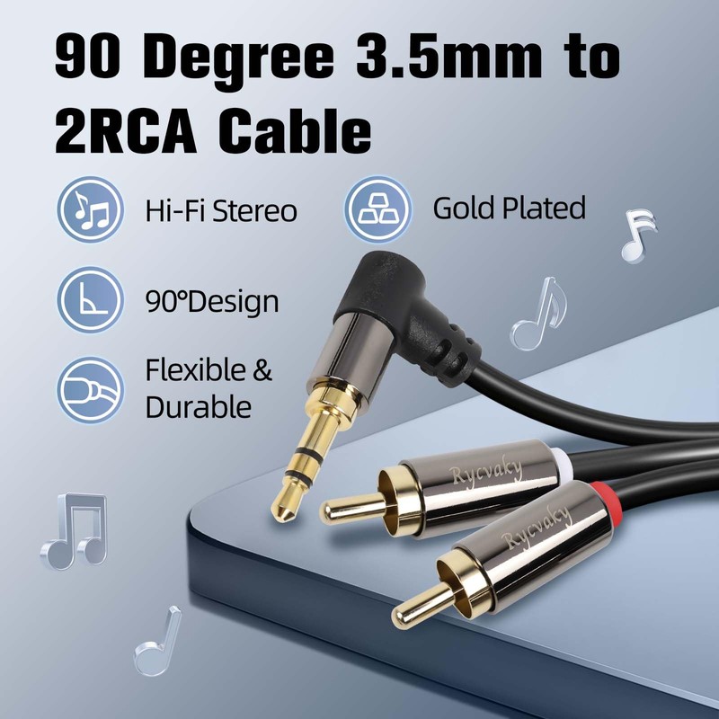- Universal Compatibile: This 90 degree 3.5mm to 2 RCA audio auxiliary stereo cable with Y splitter helps you plug the 3.5mm connector into the headset jack of your mobile device and the 2 RCA connector into the port of the audio system in a simple way. Compatible with iPhone, iPod, iPad, MP3 player, CD player, laptop, tablet and any other digital devices with 3.5mm audio jack and amplifiers, subwoofers or receivers with RCA jack.