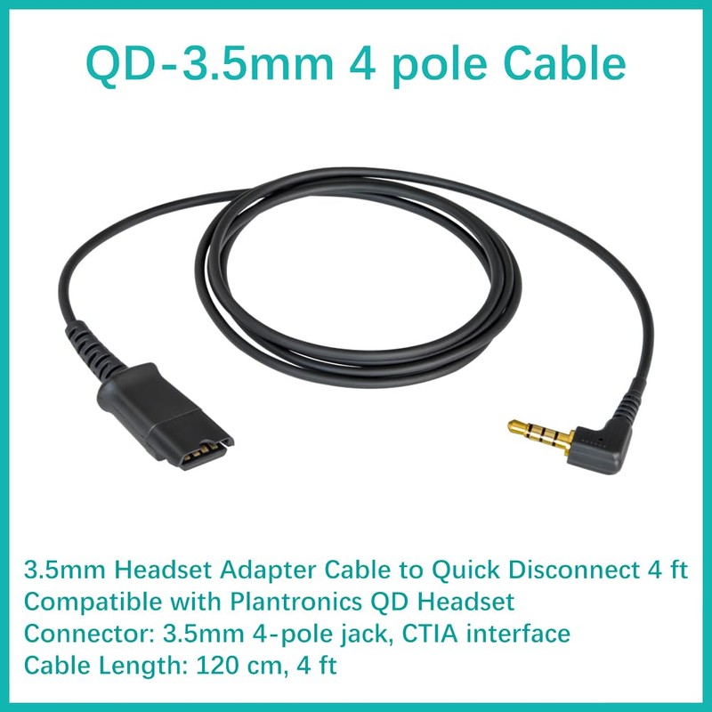 • Connection Type: 3.5mm plug 4 pole (CTIA interface) adapter cable to quick disconnect that compatible with Plantronics QD headsets.