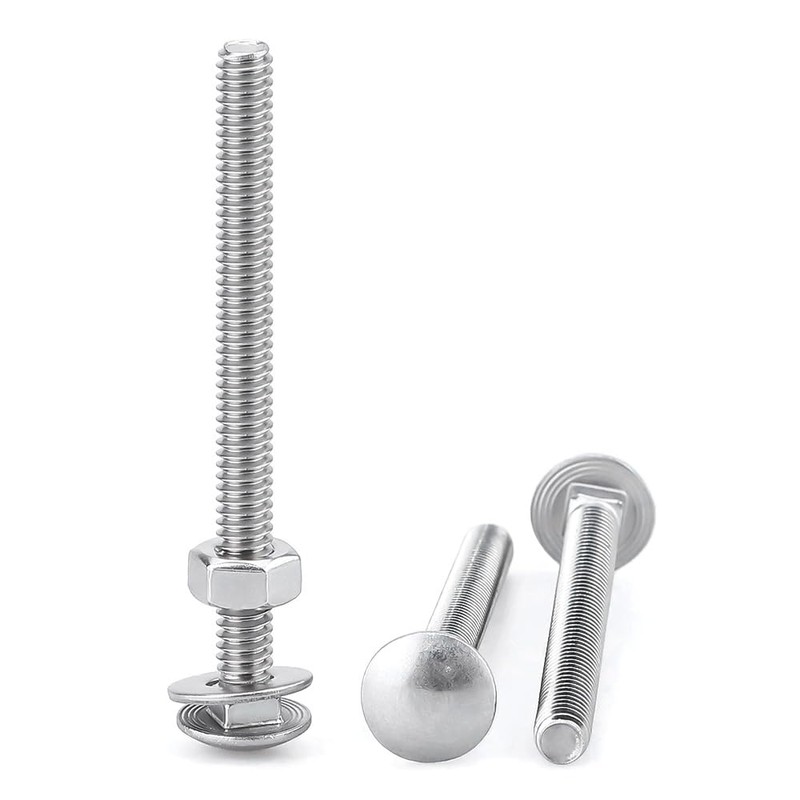 • Carriage bolts have a dome shaped head and a square neck generally requiring a hex nut and flat washer; The square neck makes them self-locking when used within a square hole;The smooth, domed head provides a semi-flush finish
