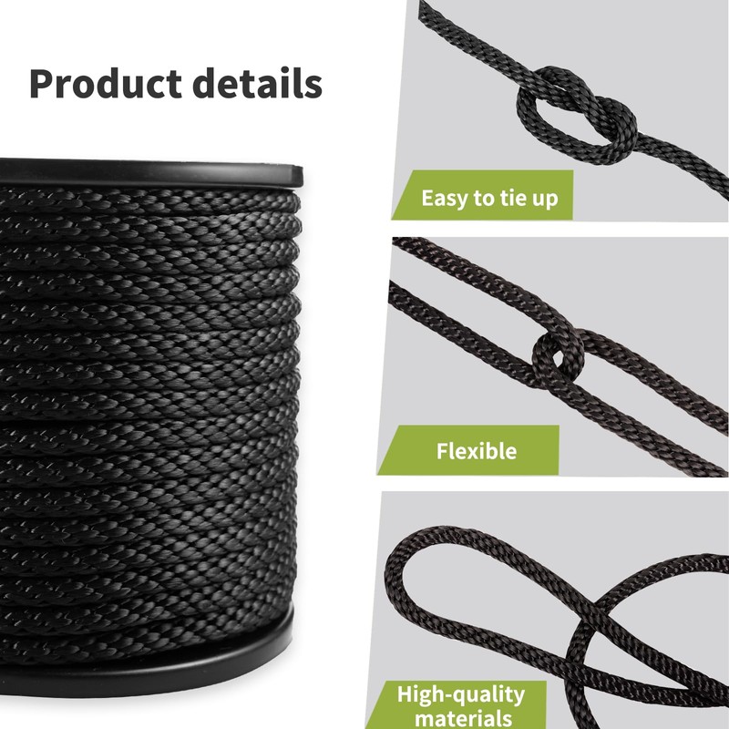 - The black polyester rope is made of high quality materia meanwhile features sturdy construction and tightly woven strands that can easily tackle some of the most back-breaking loads, It is one of the strongest ropes on the market. 3/8" diameter black polyester rope, 200' long rope, It's suggested to work within 295 kg, meet your daily needs