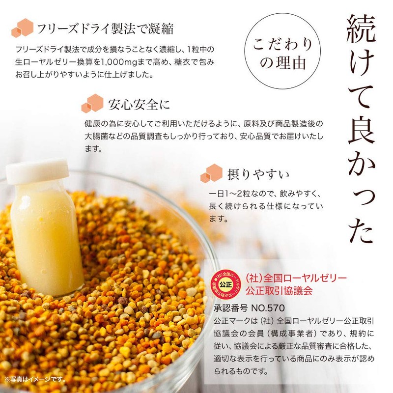 - フリーズドライ製法で成分を損なうことなく濃縮し、1粒中の生ローヤルゼリー換算は1,000mgと高含有[国内製造品]