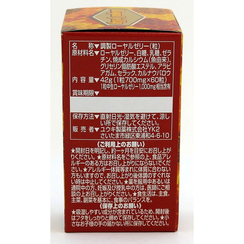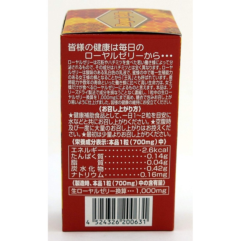 - 原材料名 : ローヤルゼリー末、砂糖、乳糖、ゼラチン/骨焼成カルシウム、グリセリン脂肪酸エステル、増粘剤(アラビアガム)、セラック、カルナウバロウ(一部に乳成分・ゼラチンを含む)